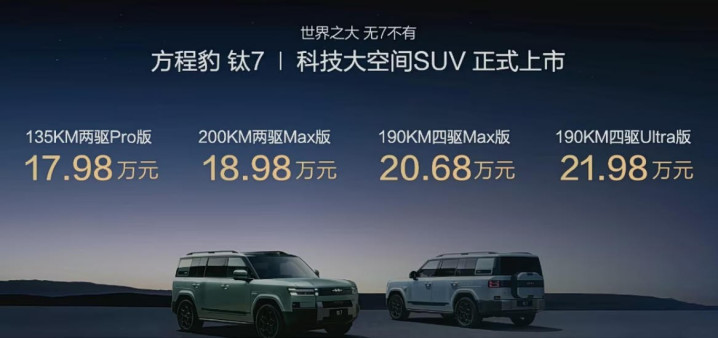 至于说为什么买钛7顶配Ultra版的人占比那么多,我觉得,一是因为方程豹钛7四款车型之间的价格差并不大。毕竟,即便是最低配的135km两驱Pro版本,其和最顶配的190km四驱Ultra版在价格上也就仅相差了4万块钱。而消费者所能够得到的,单在“三大件”层面就多了四驱系统、更长的190km纯电续航以及前后双电机,也就更别提在配置上还多出的功能了。