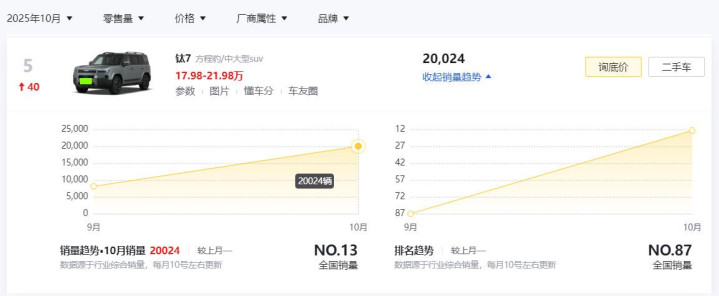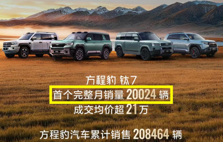 近日,10月份零售销量正式出炉,方程豹钛7以20024辆新车的销量数据,成为了方程豹品牌在售所有车型里表现最好的“选手”。同时,超过2万辆的月销量成绩,也让其坐稳了方盒子SUV市场销冠的位置,堪称真正的“大爆款”。